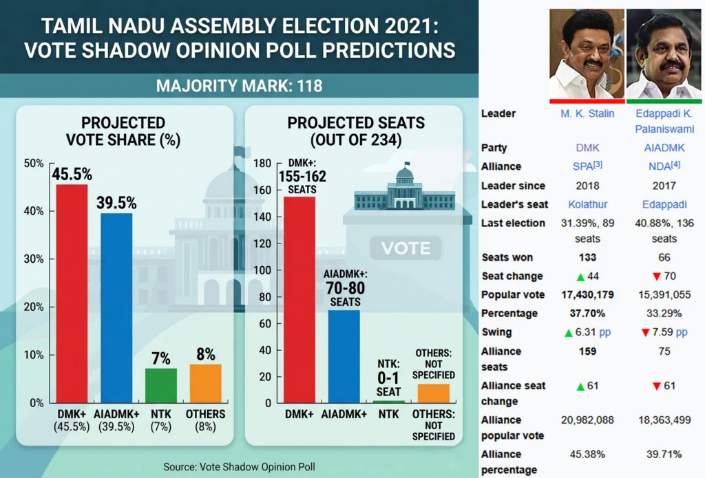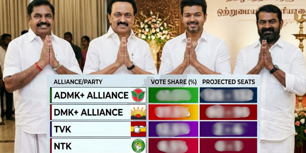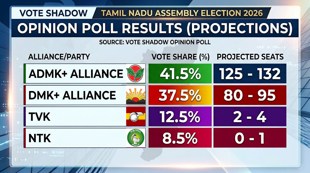 Vote Shadow நிறுவனம் வெளியிட்டுள்ள சமீபத்திய 2026 தமிழக சட்டமன்றத் தேர்தல் கருத்துக்கணிப்பு, மாநில அரசியலில் கடும் போட்டி நிலவுவதை வெளிப்படுத்துகிறது.